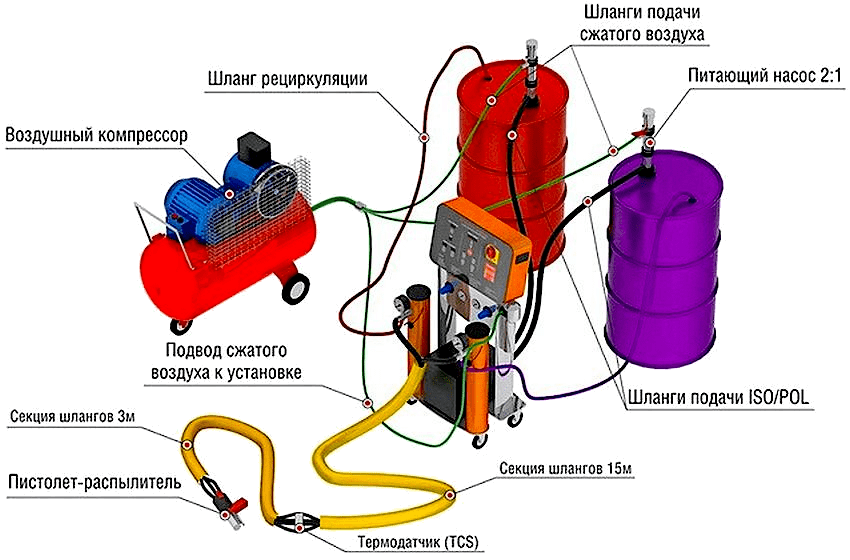 Смешивание полиола и изоционата происходит непосредственно во время выполнения работ. Эти материалы поставляются в двух баллонах, которые соединяются между собой и с распылителем с помощью шланга.