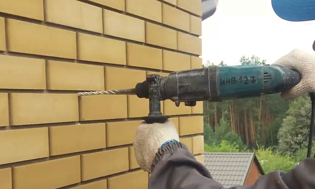 Предварительно сверлят отверстия в стене в шахматном порядке. Диаметр отверстий 12-14 мм расстояние между ними зависит от ширины зазора между стенами.