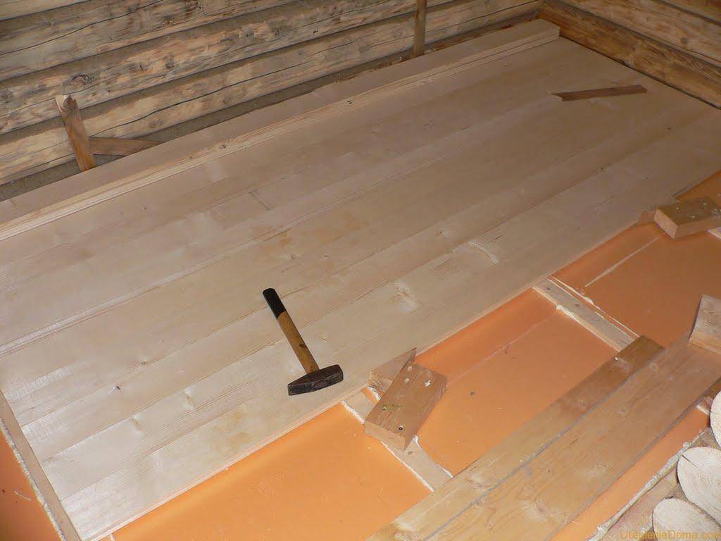 Следующий слой предполагает укладку гидроизолятора, который создает барьер для проникновения воды на утеплитель. Укладка чистового пола ведется из оструганных шпунтованных досок, а затем их обрабатывают водоотталкивающей и антисептической пропиткой.