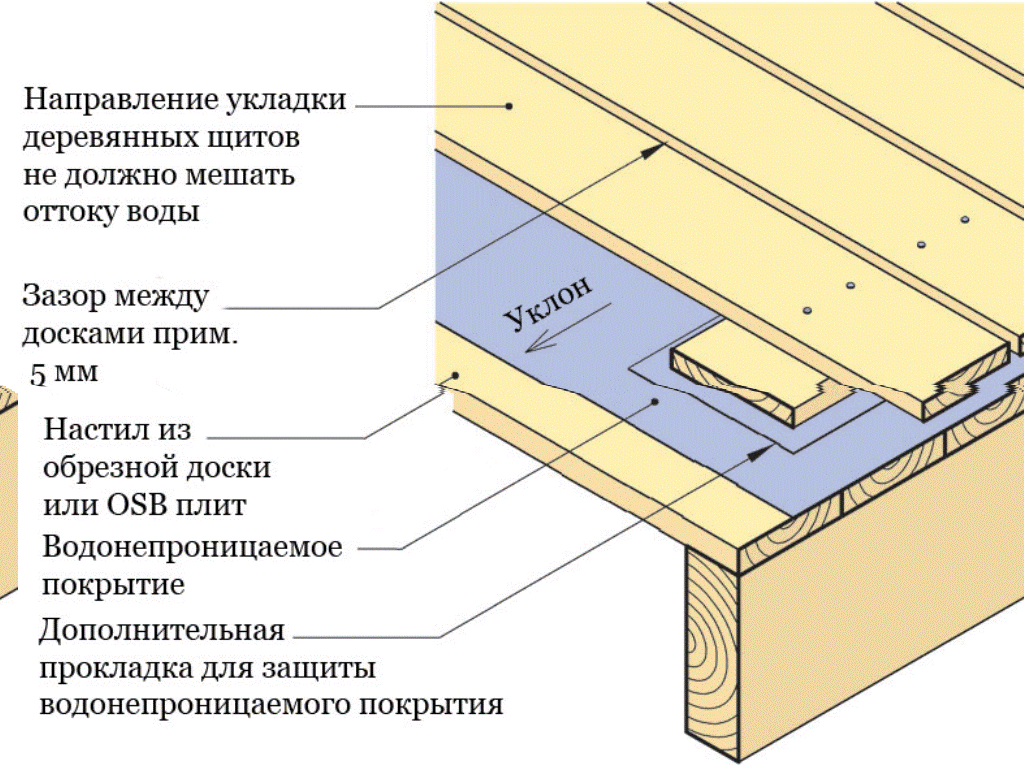 - Сначала создается поверхность из плит или досок. По ней обустраивается пароизоляция и влагозащита.