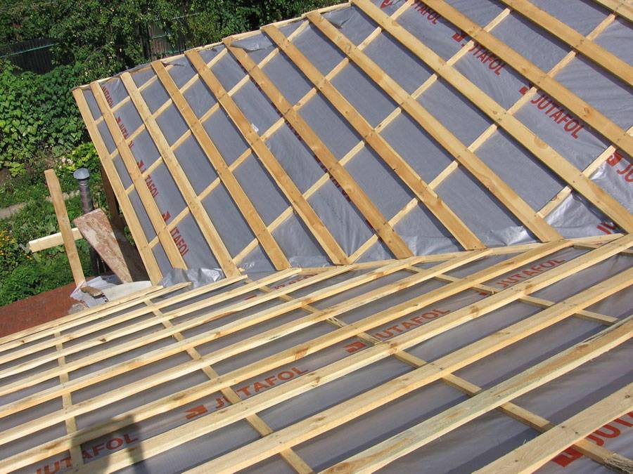 Монтаж гидроизоляционной пленки производится сверху на утеплитель. Она обеспечивает отвод влаги от материала. Пленка с помощью дюбелей закрепляется на рейках. Швы дополнительно проклеиваются специальным металлизированным скотчем.