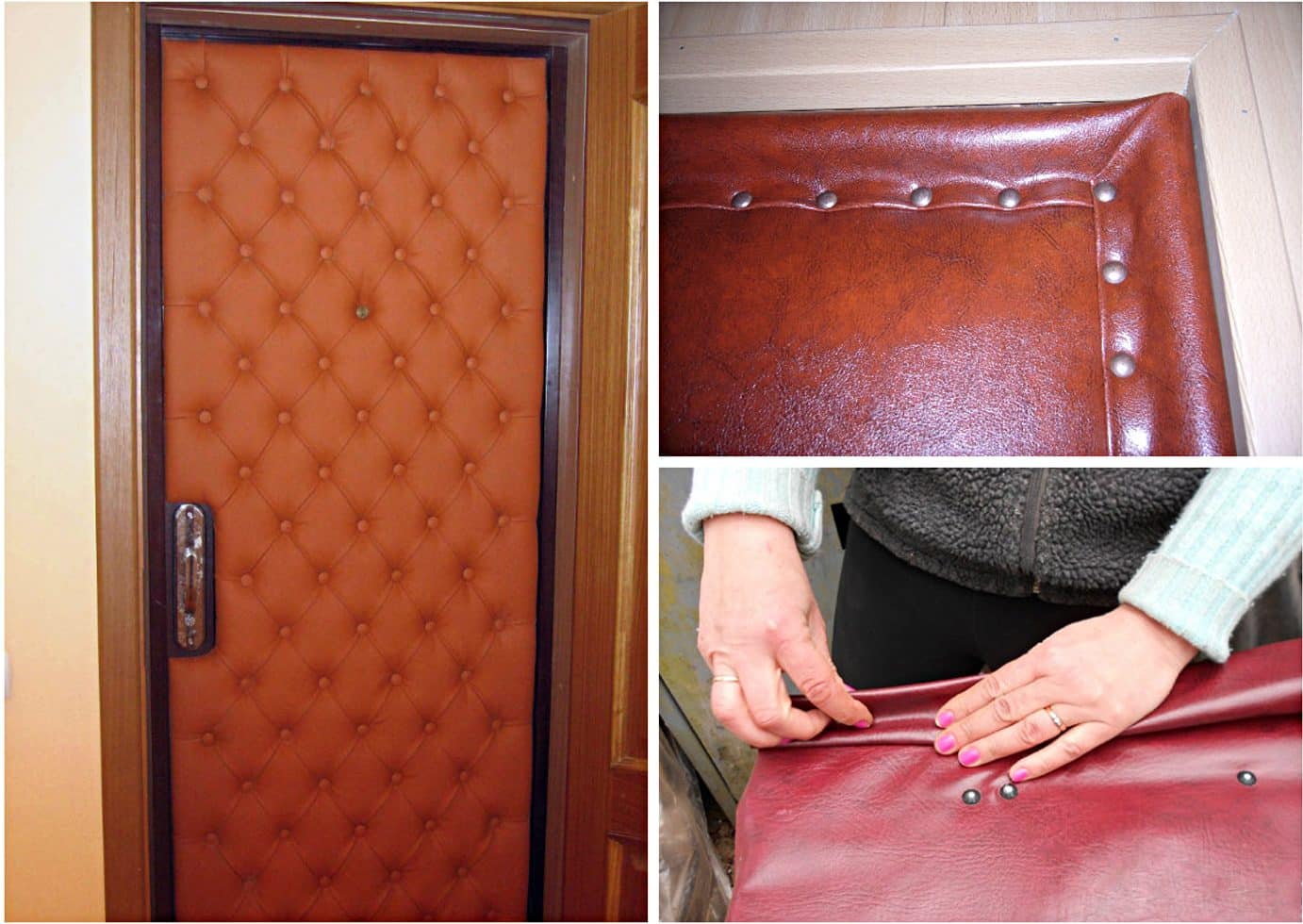 Чаще всего это делается не только с целью утепления, но и с целью звукоизоляции. Этот вариант подходит в том случае, если вы не хотите разбирать ваше дверное полотно, и не уверены, что оно разборное. В таком случае необходимо поверхность дверей оклеить специальным утеплителем, который отражает свет и тепло. Такие материалы продаются в рулонах и стоят достаточно дешево. Крепятся они на обычные жидкие гвозди. После этого осуществляется украшение или обивка дверей при помощи дермантина или деревянных реек.