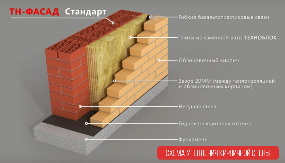 - устроить стены из трех невентилируемых слоев. Утеплитель закрепляется с помощью раствора. Затем оставляется небольшое воздушное пространство и возводится наружная стена толщиной в один кирпич;
