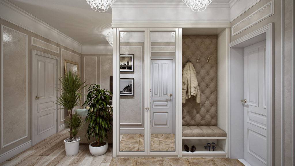 Такой вариант подходит для любой прихожей. Если планировка холла предусматривает нишу, можно использовать ее для установки системы хранения.