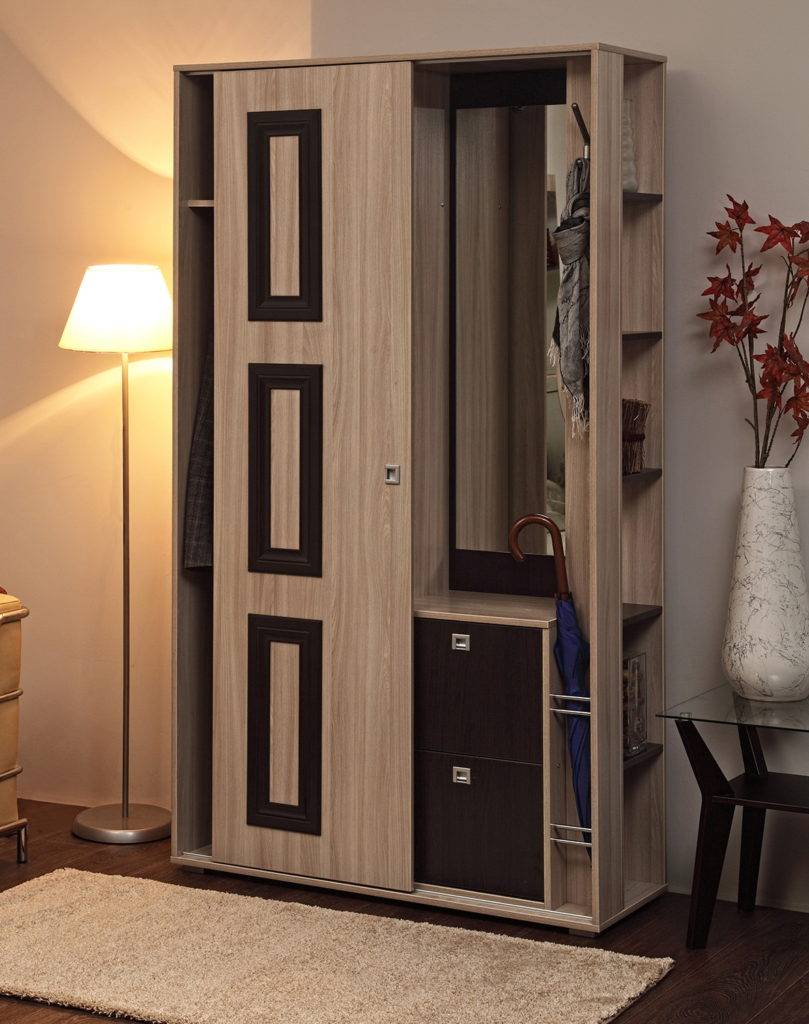 Если еще есть свободное место, поставьте обувницу. Она может быть в виде узкого комода с откидными ящиками или в виде тумбочки с наклонными проволочными полками. И тот, и другой вариант неплохи. Эту компоновку уже вряд ли можно назвать компактные прихожие в коридор, но это и не супер большой гарнитур.