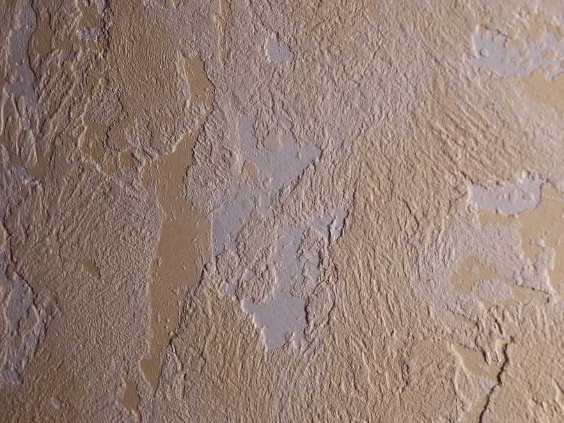 Для достижения такого эффекта первый слой делают разнотонным. Сделать венецианскую штукатурку своими руками такого типа довольно просто. Для начала нужно приготовить 2-3 порции раствора разных тонов, после чего перемешать их, но не полностью. Смесь набирают на кельму или широкий шпатель и укладывают толстым слоем на поверхности. Нанести состав в этом случае недостаточно, нужно еще и просушить покрытие строительным феном. Устройство держать на разном расстоянии от разных участков стены, чтобы получилась неоднородная текстура. На поверхности должны появиться характерные трещины. Затем покрытие оставляют в покое на 48 часов, чтобы оно досохло естественным путем. Далее наносят второй слой штукатурки другого оттенка. В конце поверхность обрабатывают шлифовальной машинкой или наждачной бумагой, а затем натирают воском или покрывают лаком.