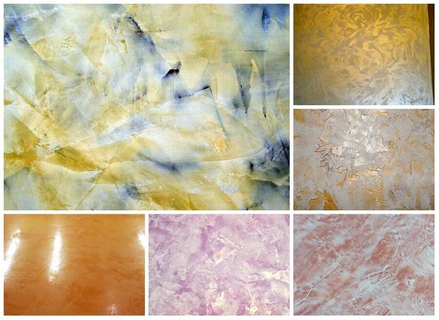 После этого приостанавливают работы на 2 часа. Теперь нужно приготовить 2-4 вида раствора, используя различное количество колеров. Их набирают небольшими порциями на шпатель или кельму, после чего наносят длинными дугообразными мазками. После обработки всей поверхности ее оставляют высыхать на сутки. При необходимости повторяют вышеописанную процедуру 2-3 раза, при этом для высыхания каждого слоя требуется не менее суток. Высохшую поверхность обрабатывают три раза шлифмашинкой, каждый раз меняя насадки. В конце проводят так называемое «железнение» — обработку кельмой, во время которой инструмент с силой прижимают к поверхности. Последней процедурой является обработка воском или лаком.