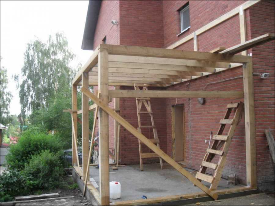 Каркас кровли составляют стропила, стойки, обрешетка, которые изготавливают из досок наименьшей влажности, около 50 мм в толщину. Одна сторона сооружения должна опираться на дом, а другая должна крепиться к каркасу стен веранды из дерева.