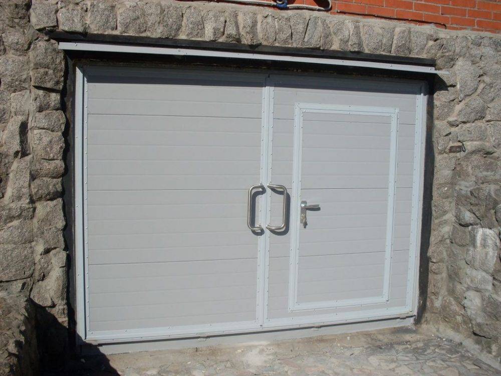 Самый простой по конструкции вид гаражных ворот. Распашные полотна изготавливают из прочного металла и укрепляют надежной рамой. В одной из створок обычно делают дверной проем, чтобы можно было зайти в гараж или выйти из него не открывая ворота полностью.