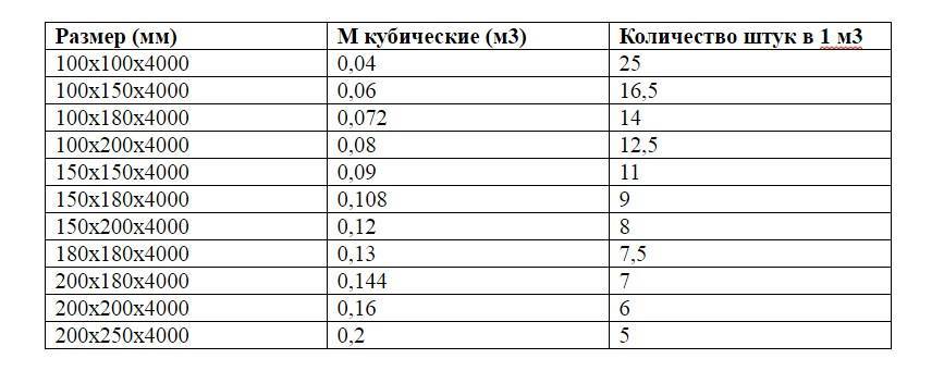 Данную таблицу удобно применять и к брусу длиной 2 метра, для этого их количество следует удвоить. Еще проще вычислить, сколько в кубе бруса 100 мм толщины, ведь оперировать круглыми цифрами очень легко. Или когда оба размера одинаковы, как например 50х50 или узнать, сколько бруса 100х100 в 1 кубе.