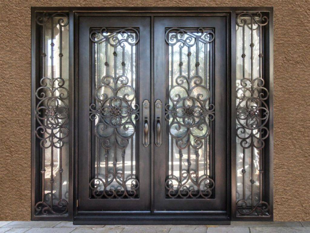 Входные кованые двери, имеющие вставки со стеклом, защищенные решеткой, по внешнему виду уступают конструкциям с прочными стеклопакетами. Как бы изящно была не выполнена кованая защита, она утяжеляет внешний вид, а порой даже его портит.