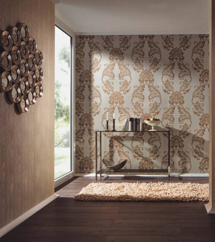 Отделка с металлическим блеском – настоящая роскошь. Особенно эффектно смотрится выпуклый орнамент такого типа. Вариантов два – виниловые обои, окрашенные специальными красителями либо металлизированные обои.