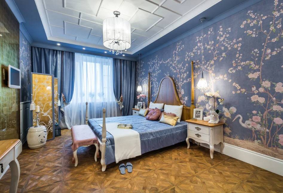 - Классика. Главное в отделке классических стилей – упор на роскошь. Какой она будет, сдержанно-благородной или эффектной, зависит от вкуса хозяев. Приобретайте полотно с необычными орнаментами, включающими вензеля, цветы, узоры (например, дамаск). Удачное дополнение – позолоченные фрагменты.