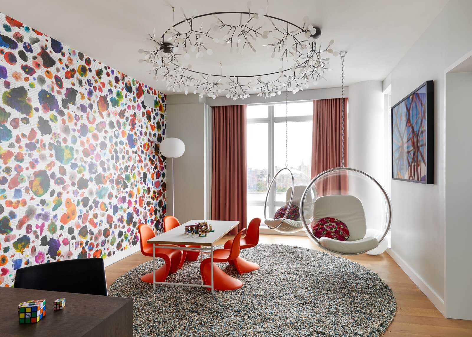 Современный (контемпорари). Предпочтительны однотонные обои, или с мелким рисунком. Однако акцентная стена может быть яркой, содержать необычные принты или имитировать кирпичную поверхность.