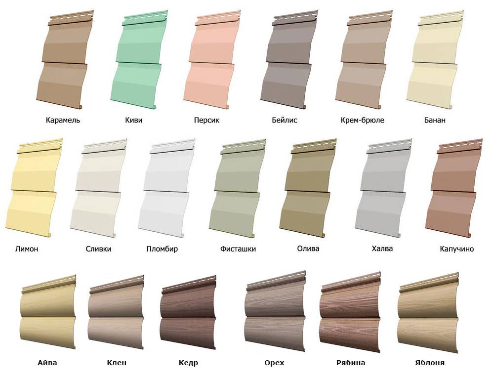 Цвета акрилового сайдинга для наружной отделки включают в себя обширный диапазон оттенков. Помимо этого сайдинг может иметь имитацию под металл, дерево, бревно и т.д.