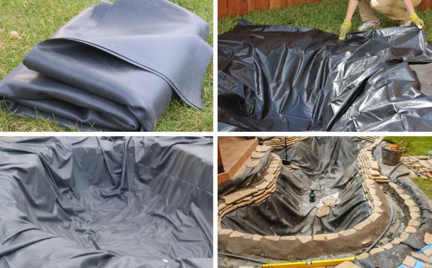Для гидроизоляции лучше использовать пленку из ПВХ – она долговечная и прочная. А если вы выберете бутилкаучук, пруд с водопадом может прослужить несколько десятилетий. Выстилаем котлован слоем гидроизоляции таким образом, чтобы значительная часть материала (не менее 1,5 метра), располагалась над котлованом, чтобы пленку можно было хорошо зафиксировать.