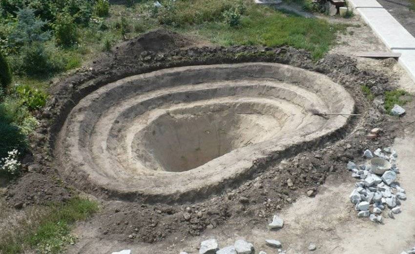 При создании углубления можно работать ручным инструментом или нанять экскаватор — всё зависит от масштаба деятельности. Сначала делают террасы от 30 до 50 см шириной и до 30 см глубиной, а потом основную яму. Угол сечения от земной поверхности до дна должен составлять 45°. Глубина зависит от высоты купленной формы, если ёмкость не используется — от желания хозяина.