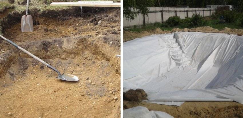 Готовое дно углубления следует выровнять. Осколки камней, грунт, щебень обязательно надо удалить, они могут нанести ущерб покрытию. Дно засыпают песком на 5–8 см. Затем следует покрыть подстилку полотном из геотекстиля. Это убережёт покрытие от разрушения и продлит его долговечность.