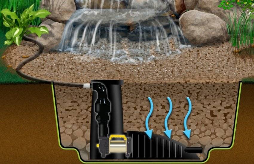 Принцип действия этих вариантов один — перекачивание воды с помощью насоса с фильтром и системой водооборота. Вода обязательно падает в какую-либо емкость (бассейн), из которой и происходит ее забор обратно в систему.