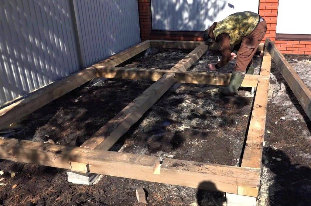 Необходимо сделать в земле отверстия, глубиной, около 30 сантиметров. Засыпать это место щебенкой с мелкой фракцией, утрамбовать и залить бетоном. На опорные точки будут крепиться лаги для пола. Внутрь опорных точек, можно поставить стальные вставки с отверстиями, для установки брусьев.