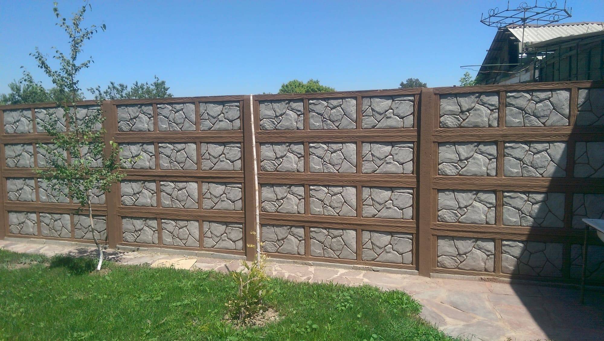 Считается самым роскошным, надёжным, но и дорогим. Необязательно использовать природный камень, можно заказать забор из синтетического материала или простой гальки, булыжников, что тоже будет смотреться отлично. Такому забору часто ни к чему дополнительные украшения, он хорош сам по себе. Требует фундамента, как и кирпичный.