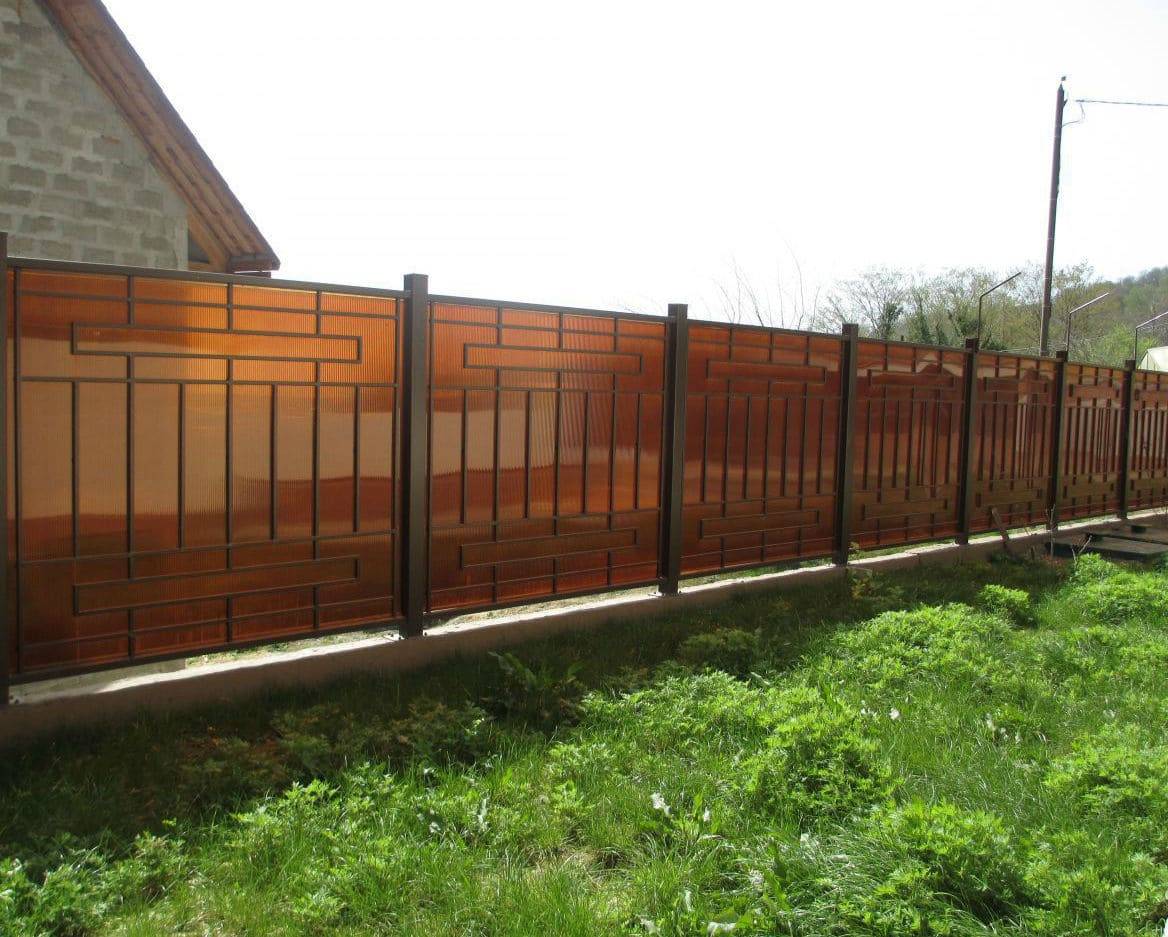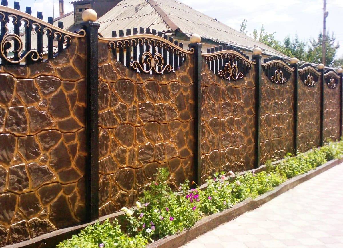 Есть ещё множество вариаций, различных сочетаний этих материалов. Наиболее популярные решения — тяжелая основа из кирпича, бетона или камня, а верх из более лёгкого профнастила, решеток или дерева. Ниже мы покажем вам множество фотографий!