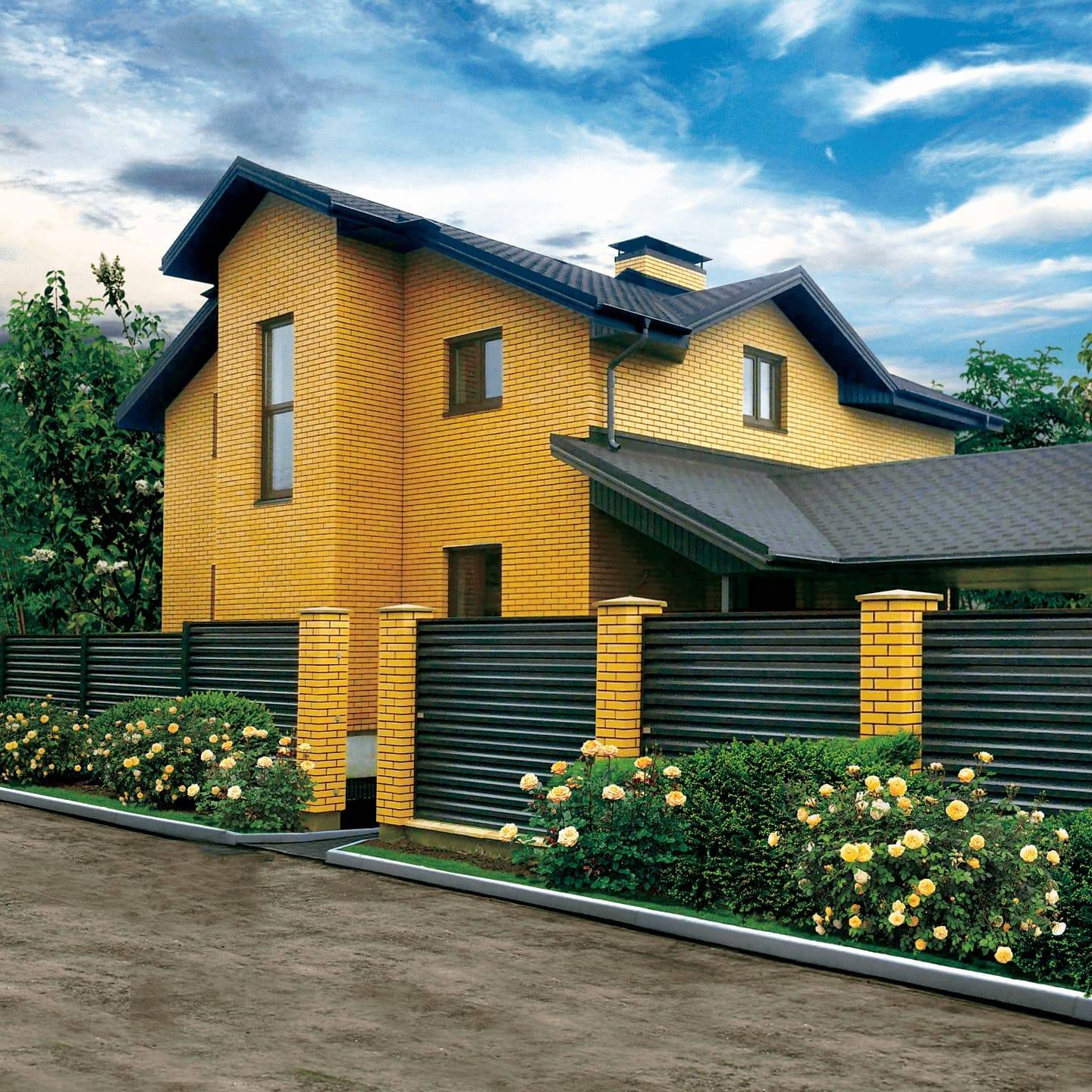 Заграждения оформляют металлическим штакетником (полоски покрываются полимерным составом разного цвета). Это современный вариант облегченного забора для дачного участка, палисадника или зеленой территории.