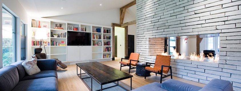 После этого можно приступать к созданию ниши размеров соответствующим габаритам очага. Как уже говорилось выше, это лучше делать на этапе строительства или ремонта. Если этот момент уже упущен, то придется выдалбливать нишу в готовой стене. Глубина такой ниши должна быть не менее 60 мм. Если ниша готовится под камин с открытой с нескольких сторон топкой, то нужно делать сквозное отверстие. Также можно рассмотреть вариант с установкой такого камина в перегородку для разграничения пространства в просторной комнате.