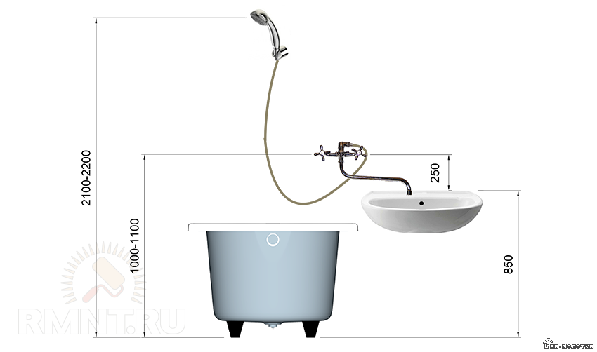 - отсчитывать расстояние до точек крепления смесителя и лейки нужно от дна ванны или кабины, расстояние от пола – величина ненадёжная, она зависит от высоты ножек ванны и толщины её дна, и в результате душ может оказаться закреплен слишком низко, что негативно скажется на вашем комфорте;