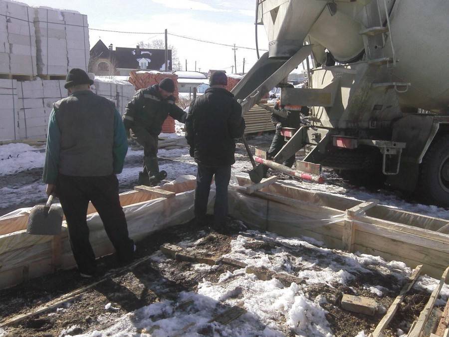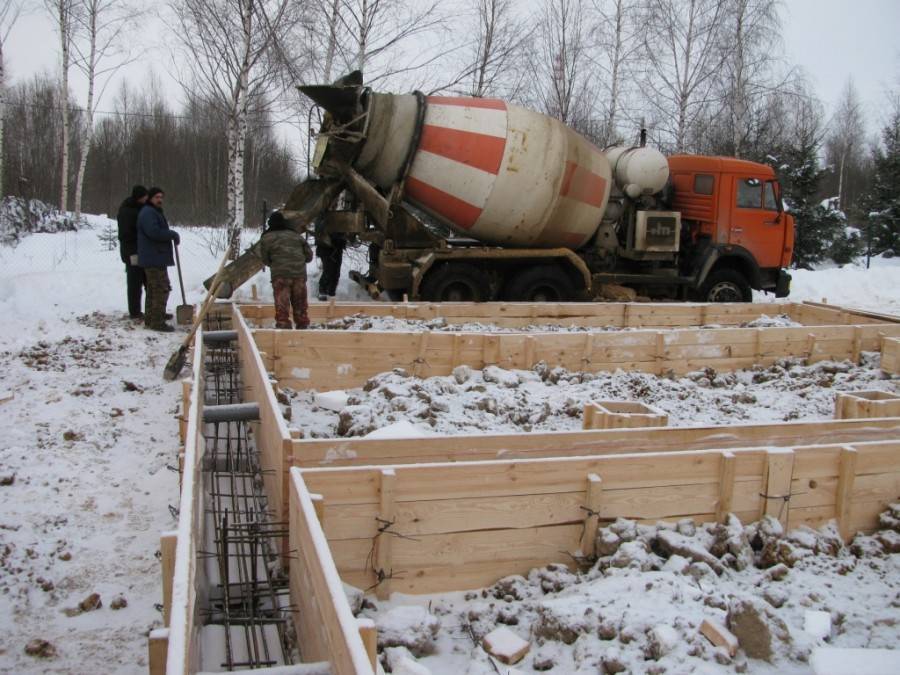 В зимнее время года также можно заливать фундамент бетонной смесью, однако следует помнить, что влияние отрицательной температуры крайне негативно сказывается на качестве бетонной смеси, так как происходит быстрое замерзание воды до самого процесса схватывания.