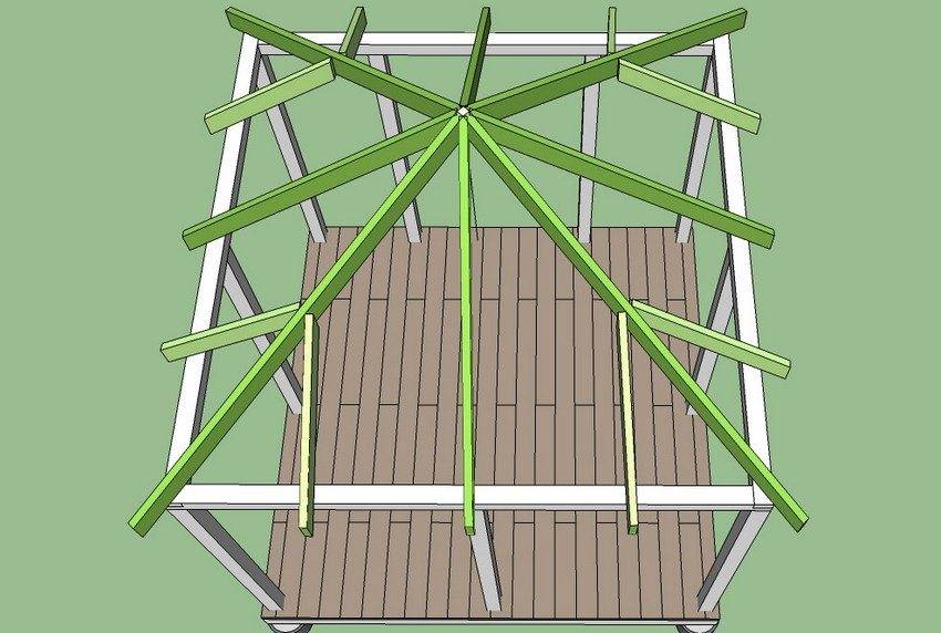 Каркас крыши для беседки монтируют на земле. Торцы стропильных балок с одной стороны зарезают под углом в 45 градусов, а с другой — вырезают замки и соединяют. Готовую конструкцию крыши поднимают и устанавливают на каркас беседки, используя болтовое крепление.