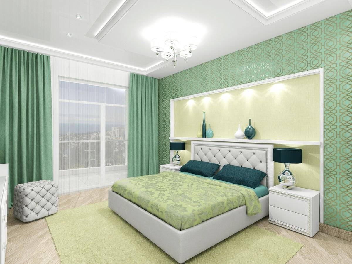В этой комнате допустимо использование ярких покрытий для акцента в прикроватной зоне или поклейка светло-зеленых обоев с цветочными и геометрическими композициями по всему периметру. В зависимости от выбранных оттенков и сюжетов ваша спальня может выглядеть романтичной, весенней, позитивной или старинной.
