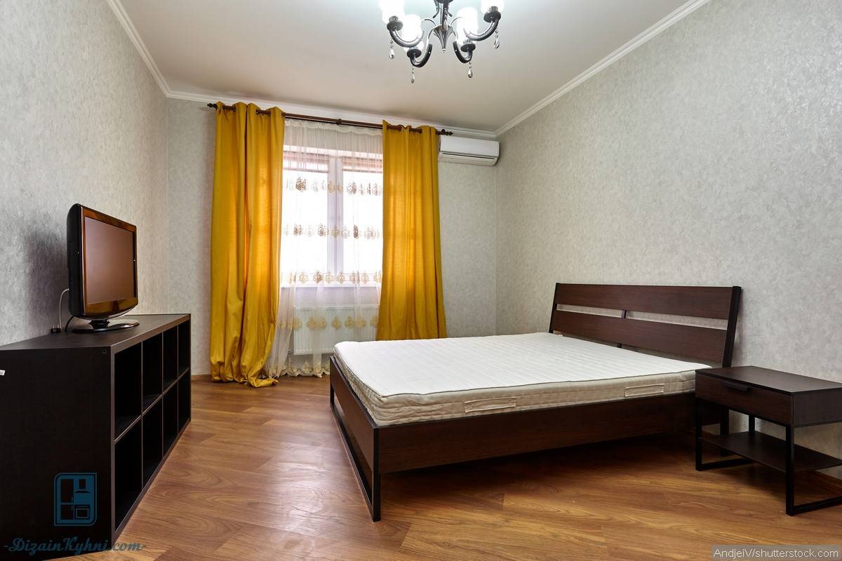 Плотные желтые шторы в спальне, позволят приглушить яркий солнечный свет и создадут ощущение комфорта.