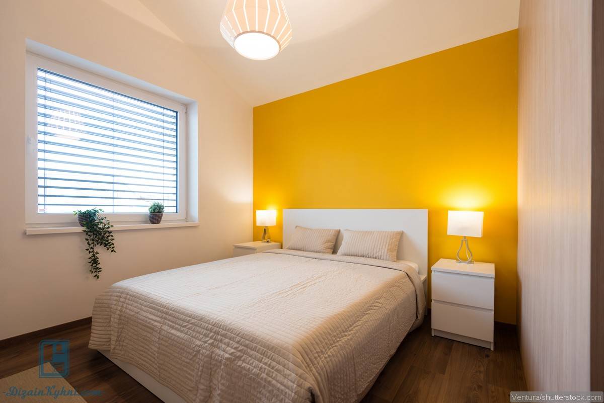 При использовании желтых обоев многие окрашивают одну стену желтым. Обычно такую стену делают у изголовья кровати. Стену напротив жёлтой делают белой. Такой вариант не будет раздражать и настроит на спокойный сон.