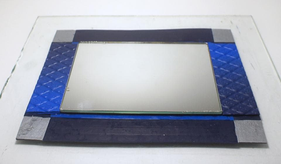 Ждем, пока остынет задняя стенка рамы и кладем ее рисунком вниз. В центральной части размещаем зеркало. Аккуратно смазываем жидкой пластикой рамку.