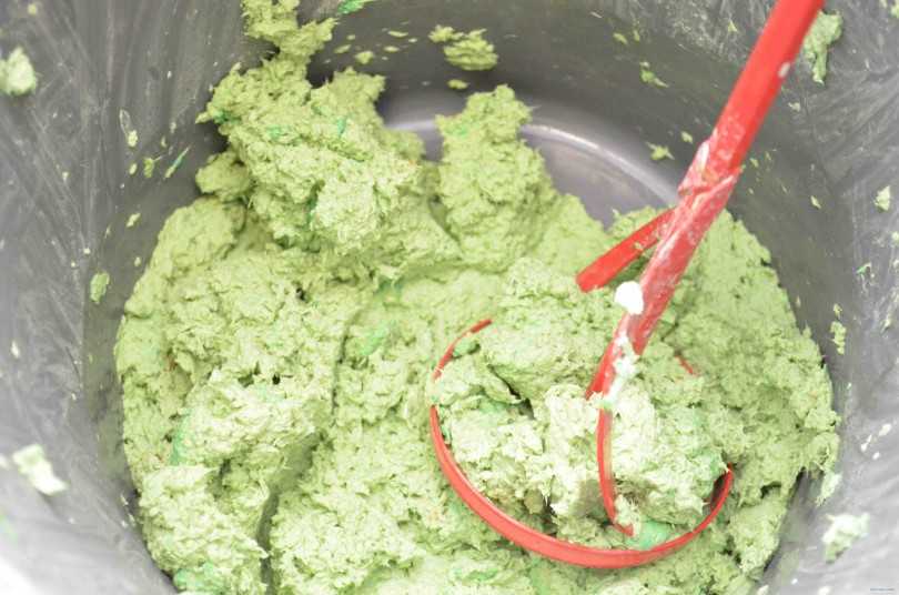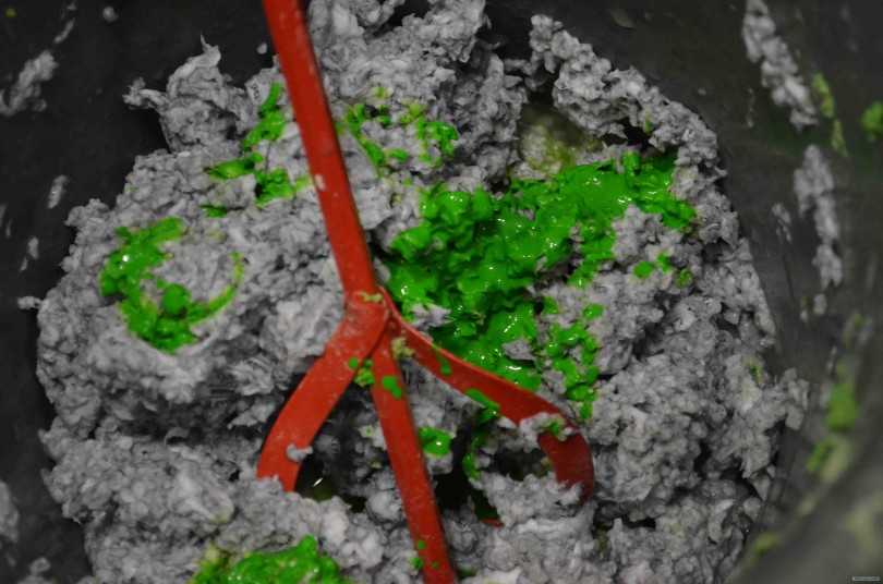 В процессе всего нужно будет рвать газеты понемногу подкидывая к уже имеющейся массе и постоянно перемешивая миксером. Только таким образом можно впоследствии получить желаемый цвет, после того как будет добавлен краситель.