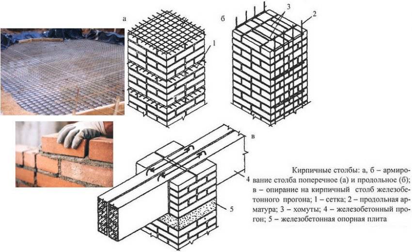 Для формирования каркаса можно использовать армирующую сетку или металлические пруты. Во втором случае пруты следует связывать между собой проволочной скруткой. Их нужно укладывать через каждые 3 слоя кирпичной кладки. В углах устанавливают вертикальные пруты, к которым также крепится арматурная сетка каркаса.