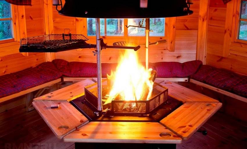 Основное предназначение мангала — служить приспособлением для жарки мяса, рыбы, овощей и пр. Имея такое оборудование в беседке, можно быть уверенным, что вкусный шашлык приготовится при любой погоде. Что же касается вопроса обогрева, нужно отметить, что тепла, которое вырабатывается от костра, хватит для небольшого помещения, и то при условии, что оно при строительстве достаточно утеплено.