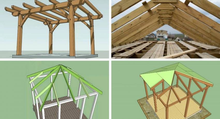 Форма крыши будет во многом зависеть от конфигурации беседки. Например, у шестигранной постройки крыша будет шестискатной, а у прямоугольной или квадратной она может быть плоской, одно- или двускатной. На выстроенные стены и столбы укладывают гидроизоляцию. Сверху на ней устанавливают деревянный брус или доски 50×150 мм.